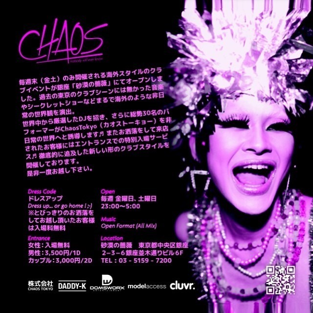 世界中から厳選したDJを招き、さらに総勢30名のパフォーマーがChaosTokyo(カオストーキョー)を非日常の世界へと誘導します♬