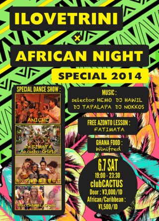 この日の目玉はガーナ発のダンスミュージック「AZONTO」のFREE DANCE LESSON BY FATIMATA!この機会にAZONTOのステップを覚えてみませんか?またガーナフードもご用意しております。6/7の土曜日はカリブ&アフリカな夜を楽しみましょう!