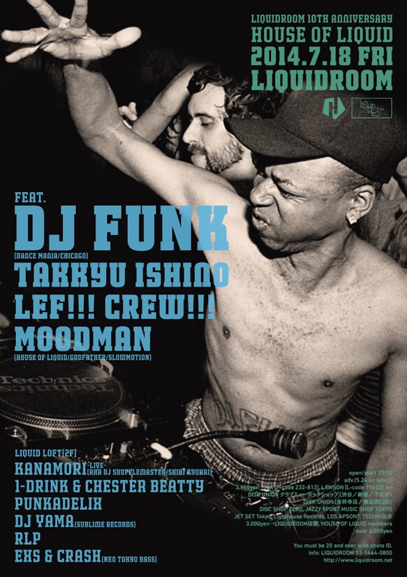 ハウス・ミュージックの母なる都市=シカゴ。そこで生まれたビートは、いまやポップ・ミュージックから、アンダーグラウンド・ダンス・ミュージック、はては各国の街路に響くゲットー・ミュージックにも多大な影響を与えている。そのオリジネイター、フランキー・ナックルズの死には、オバマ大統領ですら追悼の手紙を書いたという。そんなシカゴの地から、〈DANCE MANIA〉などを通じて1990年代初頭に、どす黒い彗星のごとく現れたDJファンク。ワイルドで淫らなシカゴ・ハウスの最深部からの使者。まさにその名の通り、かの地のグルーヴを“ファンク”で濃縮した楽曲で、おすまししたフロアですらロック、えげつなくシェイクする。シカゴ・ハウス最深部、JUKE/FOOTWORKにも多大なる影響を与えたシカゴ・ゲットー・ハウスの帝王、ひさびさの来日! 共演にはこれまた野太いファンクネスを操る石野卓球、各所で話題を集める熱量満載のDJユニット、LEF!!! CREW!!!、そして業師ムードマンが登場。2F、LIQUID LOFTもベテラン~新世代までえげつないグルーヴを備えたDJたちが大集合。言うなればブーティな怪獣大戦争の様相! み の が す な!(河村祐介)