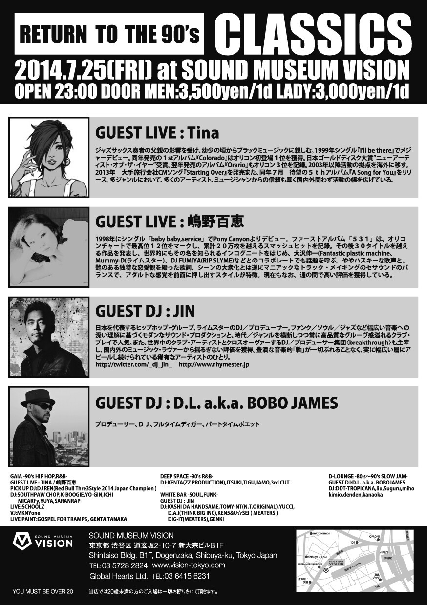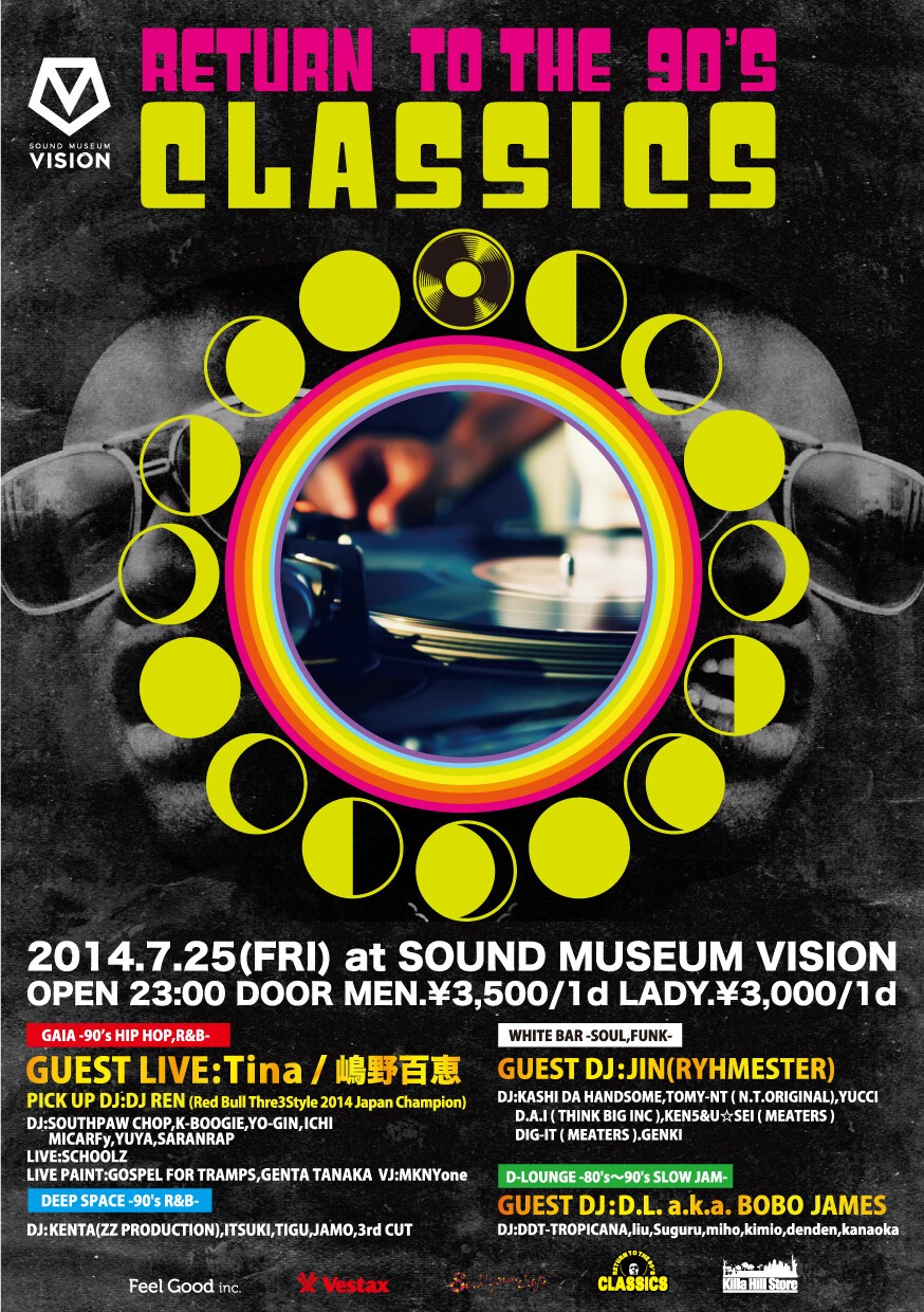 “CLASSICS”。「ヒップホップの黄金期」と称される90年代にフォーカスしたこのパーティのベースを支えるのは、間違いなくレジデント陣の誇る強力なスキルである。とりわけ5月に開催された“Red Bull Thre3Style 2014”のジャパンファイナルで見事優勝し、世界への切符をつかみとったDJ RENのパフォーマンスには、今回ひと際注目したいところだ。さらに、今後予定されるゲストアーティストの発表も楽しみに待っていてほしい。