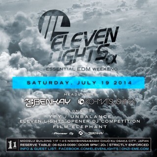 DJ: BENKAY , KO-MATSUSHIMA , YPY , unbalance , and more VJ:FILM ELEPHANT 今やオンジェムのフラッグシップイベントまでに成長し、また大阪のEDMシーンをリードする「ELEVEN LIGHTS」。 キャッチーに偏りすぎない本質的で最先端なEDMを求めるファンのために。 「ELEVEN LIGHTS」では世界最高峰のクラブミュージックで皆様の充実したナイトライフをご提案します!!