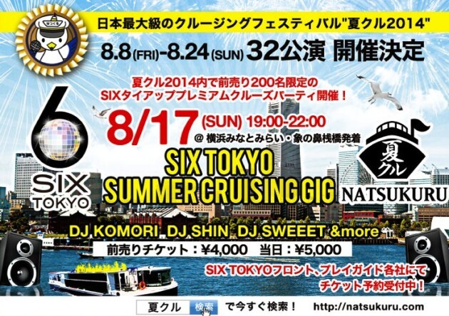 六本木最大規模のBIG CLUB『SIX TOKYO』と夏クルが公式タイアップ!毎週金土、超豪華出演者で延べ2000人近くを動員する人気CLUBとのコラボで大爆発間違い無しな1日となっています!SIX DJsの他、GUESTとしてDJ KOMORIも出演決定!みなとみらいの夜景をバックに、夏クルでしか味わえないプレミアムサマーパーティを楽しみましょう☆