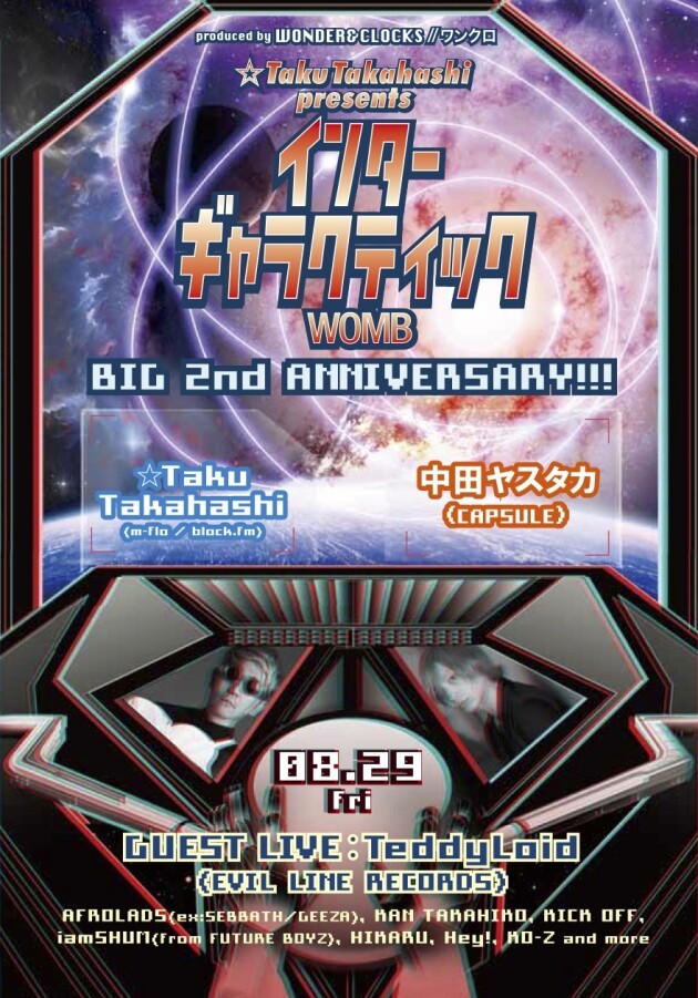 ☆Taku Takahashiによる銀河系ビッグイベント『インターギャラクティック』が、エキサイティングな2周年パーティを開催! 前回は大沢伸一がゲスト出演。クラウドをとことん熱狂させたが、その勢いそのままに今回も主役の☆Taku Takahashiが、m-floの人気曲や最新EDMチューンを交えたアグレッシヴなセットを展開する。そして、昨年の1周年パーティに続き、スペシャルゲストとして中田ヤスタカ(CAPSULE)の出演が決定!さらに、デビューEP「UNDER THE BLACK MOON」を8月27日にリリースするTeddyLoidがエクスクルーシヴなライヴセットを披露する。もちろんCYBERJAPAN DANCERSやTakeru John Otoguroといったお馴染みのメンバーも、灼熱の空間と時間をプレゼント!☆Taku Takahashiと中田ヤスタカが生み出す音楽の流星群のなかへ、いざ突入!!