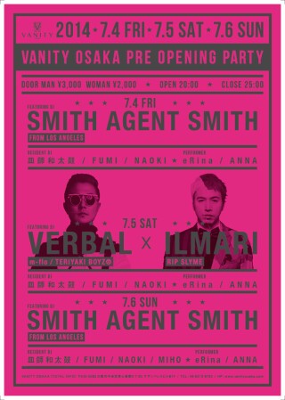 Opening Party3日間は、Smith Agent Smith from Los Angeles、VERBAL、ILMARIと豪華出演ぞくぞく決定!