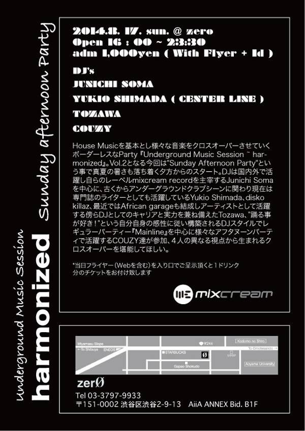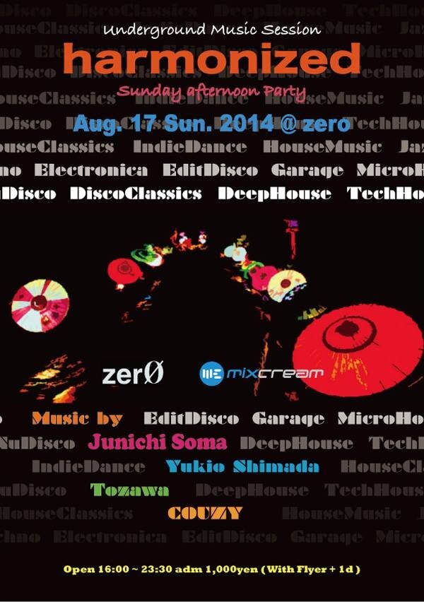 House Musicを基本とし様々な音楽をクロスオーバーさせていくボーダーレスなParty 『Underground Music Session ~ harmonized』。Vol.2となる今回は"Sunday Afternoon Party"という事で真夏の暑さも落ち着く夕方からのスタート。DJは国内外で活躍し自らのレーベルmixcream recordを主宰するJunichi Somaを中心に、古くからアンダーグラウンドクラブシーンに関わり現在は専門誌のライターとしても活躍しているYUKIO SHIMADA、disko killaz、最近ではAfrican garageも結成しアーティストとして活躍する傍らDJとしてのキャリアと実力を兼ね備えたTOZAWA、”踊る事が好き!”という自分自身の感性に従い構築されるDJスタイルでレギュラーパーティー『MAINLINE』を中心に様々なアフタヌーンパーティで活躍するCOUZY達が参加、4人の異なる視点から生まれるクロスオーバーを堪能してほしい。