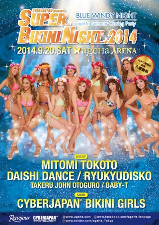 最高な盛り上がりを見せたageHa SUMMER 2014がいよいよファイナルを迎える。そしてこのファイナルを華々しく飾るのは、夏のお祭りパーティーSUPER BIKINI NIGHT!!! CYBERJAPAN BIKINI GIRLS 18名とDAISHI DANCE、RYUKYUDISKOなど豪華ゲストがフロアをヒートアップ!「盛り上がりマックス!」間違いなしの激アツパーティーを見逃すな!