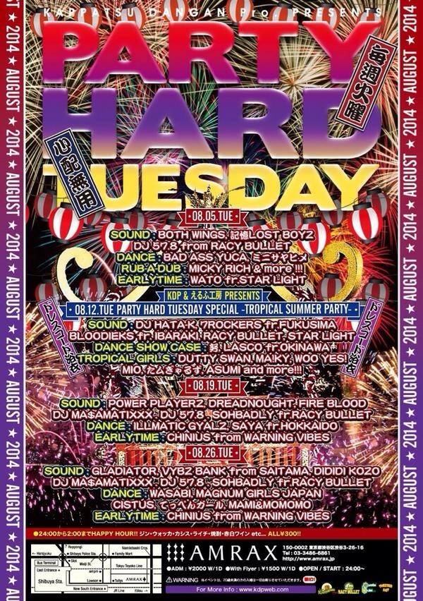 活発弾丸がプロモートする、毎週火曜のBIG PARTY!!! 2001年8月にスタートして以来現在に至るまで、毎週火曜の東京渋谷の夜を騒がしている!