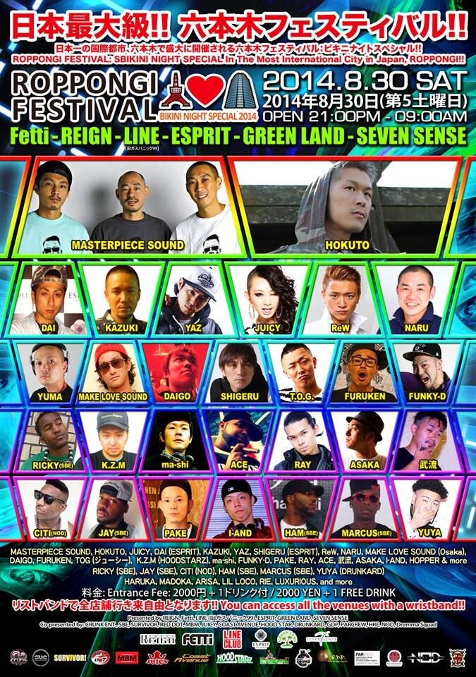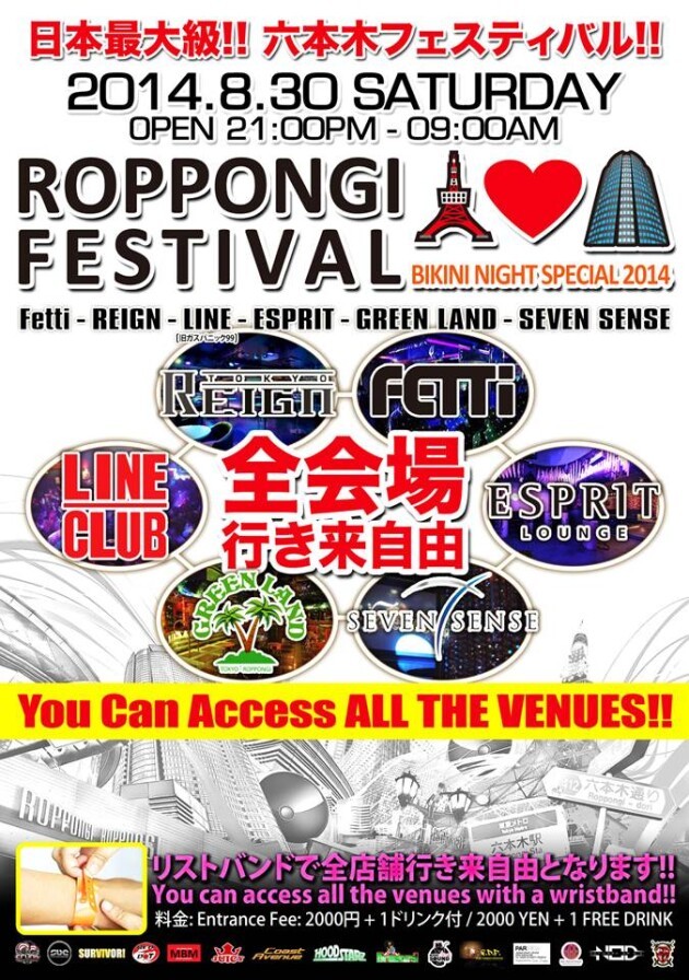 (8/30 土曜日: SATURDAY) ROPPONGI FESTIVAL BIKINI NIGHT SPECIAL 2014全6会場オールナイト行き来自由☆You Can Access 6 VENUES ALL NIGHT: Fetti-REIGN-LINE (Ex GASPANIC 99)-ESPRIT-GREEN LAND-7 SENSE