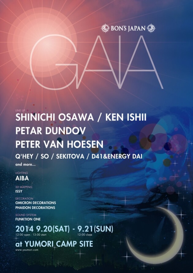 中部地方で最高峰のコンサートホール「DAIAMOND HALL」を拠点に、国内のトップアーティストを迎えイベントを発信してきた「BON'S ENTERTAINMENT JAPAN」。今年、2014年は新たなステージへの第一歩として新次元のイベントプロデュースを開始する。その名も*BON'S JAPAN GAIA* 。国内からは大沢伸一、KEN ISHIIというトップライナーを始めとし、Q'HEY、SO、SEKITOVA、ENERGY DAIと、関東、関西からDJが集結。また拠点である名古屋からも多くのローカルDJが参加する。更には前週で開催されるアウトドアフェスティバル THE LABYRINTHでプレイするPETER VAN HOESEN、PETAR DUNDOVの2組がこのGAIAにも出演し、ハウス~テクノを中心に国内外多岐に渡るラインナップが2日間をおおいに盛り上げてくれるだろう。来場者の新たな感動を解き放つべく、国内外屈指のアーティストによるパフォーマンスと、音響、映像、装飾、ホスピタリティにおいて、BON'S JAPAN GAIAの独自の世界観を表現し、「ALL THE PEOPLE ENJOY」のコンセプトの下、一切の妥協なくオープンエアフェスティバルとしての最上を目指す。