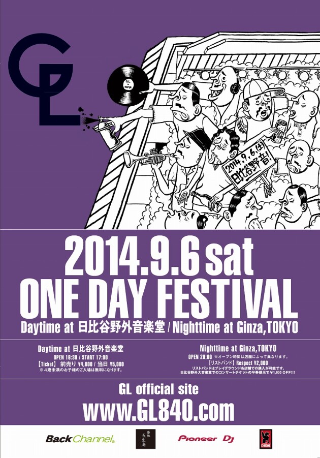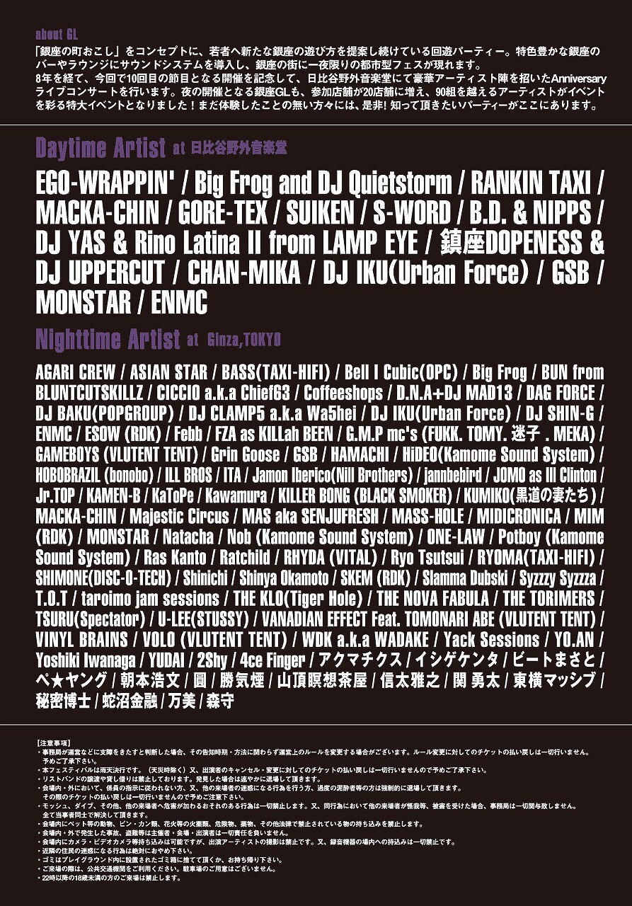 運営開始から8年を迎えたGLも10回目の開催ということで、今回はあの日比谷野外音楽堂でライブイベントを開催。出演アーティストは、音楽シーンで常に注目を浴び続けるEGO-WRAPPIN'を筆頭に、ジャパニーズ・レゲエ界のオリジネーターであるRANKIN TAXI、そしてMACKA-CHIN、GORE-TEX、SUIKEN、S-WORD、RINO LATINA II、DJ YAS(LAMP EYE)、NIPPS、B.D.(THE SEXORCIST)などHip Hopヘッズが狂喜するであろう面々、さらに鎮座DOPENESS & DJ UPPERCUT、CHAN-MIKAなど新鋭アーティストもズラリと揃い、記念イベントを盛り上げる。