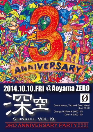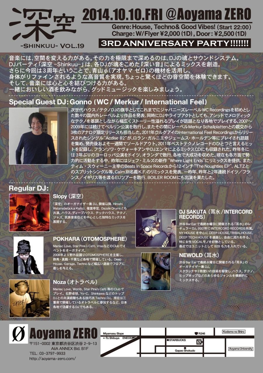 「深い音」を「良質な空間」でお届けする『深空-Shinkuu-』は、Gonnoを迎え、青山ZERO(アオヤマ ゼロ)にて3周年のアニヴァーサリーパーティを開催します!