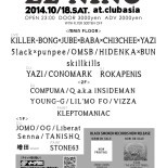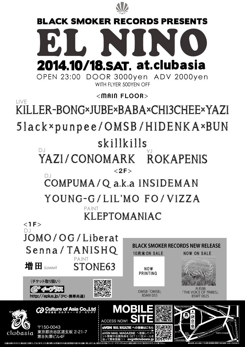 EL NINO’S godly presence! We do not need to explain it! It is so famous! Urban hip-hop label “Black Smoker” will make your autumn night special! Have you seen tonight’s line-up? We present a fantastic line – up KILLER-BONG x JUBE x BABA x CHI3CHEE x YAZI who will approach the legendary group THINK TANK which influenced and shock the 2000’s indie hip-hop scene. You will witness a deviation from hip-hop: black experiment of NEXT. Special guest will be 5lack x Punpee brother unit, OMSB (SIMI LAB) who announced a new album release by blacksmoker. YOUNG-G from stillichimiya, Expert DJ’s COMPUMA and Q a.k.a INSIDEMAN will elevate you to a higher place. LIVE DJ.VJ and Painting. You will be surprised, guaranteed!