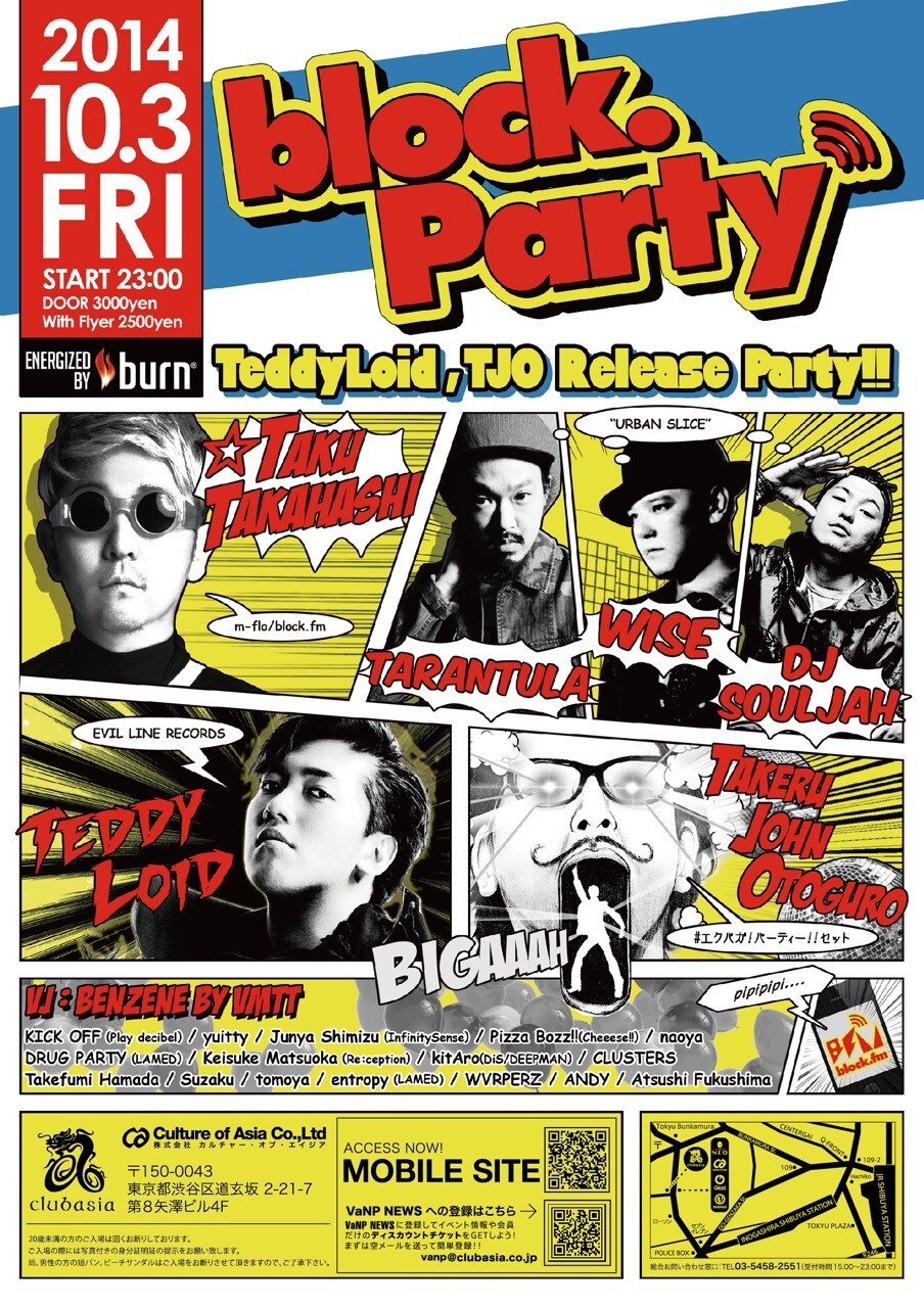 日本のトップDJ、世界を舞台に活躍する海外勢、さらにこれからのシーンを担うDJ達がラジオプログラムを持つダンスミュージックの総合情報サイト『block.fm』のオフィシャルパーティー「The Block Party energized by burn」