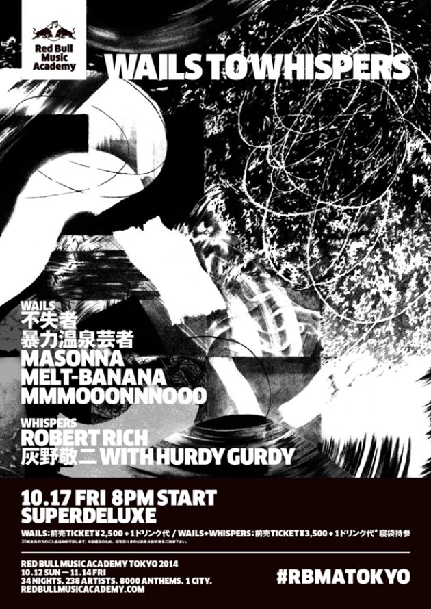 ノイズと静寂、それは対極の概念。しかしそれらは最終的には大きく異なるものではない。Red Bull Music Academyによる「Wails to Whispers」は、この両極を徹底的に追求するアーティストたちと共に、それらを深く探っていく。前半の部は「嘆きの音(Wails)」がテーマ。灰野敬二率いる日本が世界に誇る伝説的サイケデリック・ロック・バンド不失者を筆頭に、疾走感あふれるオリジナリティで世界を舞台に活動するMelt-Banana、そしてジャパノイズのベテラン暴力温泉芸者とMasonnaが、SuperDeluxeのサウンドシステムに重圧を与える。深夜の後半部は「ささやき(Whispers)」が主題となり、アンビエント音楽の先駆者Robert Richがかの有名な「スリープ・コンサート」を遂行、そして灰野敬二が弦楽器ハーディー・ガーディーを用いたパフォーマンスを披露する。