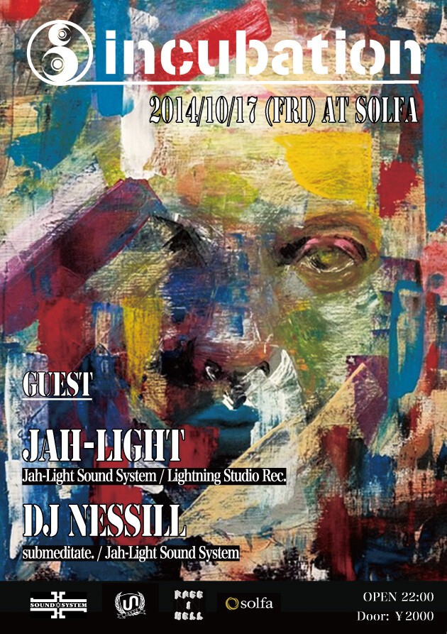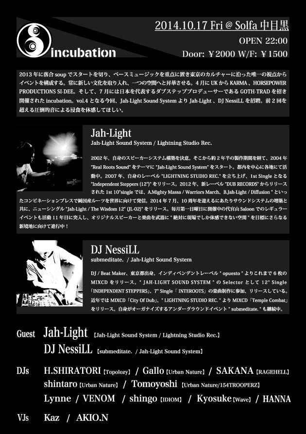 2013年に落合soupでスタートを切り、ベースミュージックを重点に置き東京のカルチャーに沿った唯一の視点からイベントを構成する。常に新しい文化を取り入れ、一つの空間へと昇華させる。4月にUKからKARMA、HORSEPOWERPRODUCTIONS SI-DEE。そして、7月には日本を代表するダブステッププロデューサーであるGOTH-TRADを招き開催されたincubation。vol.4となる今回、Jah-Light Sound SystemよりJah-Light、DJ NessiLLを招聘。前2回を超える圧倒的音による浸食を体感してほしい。