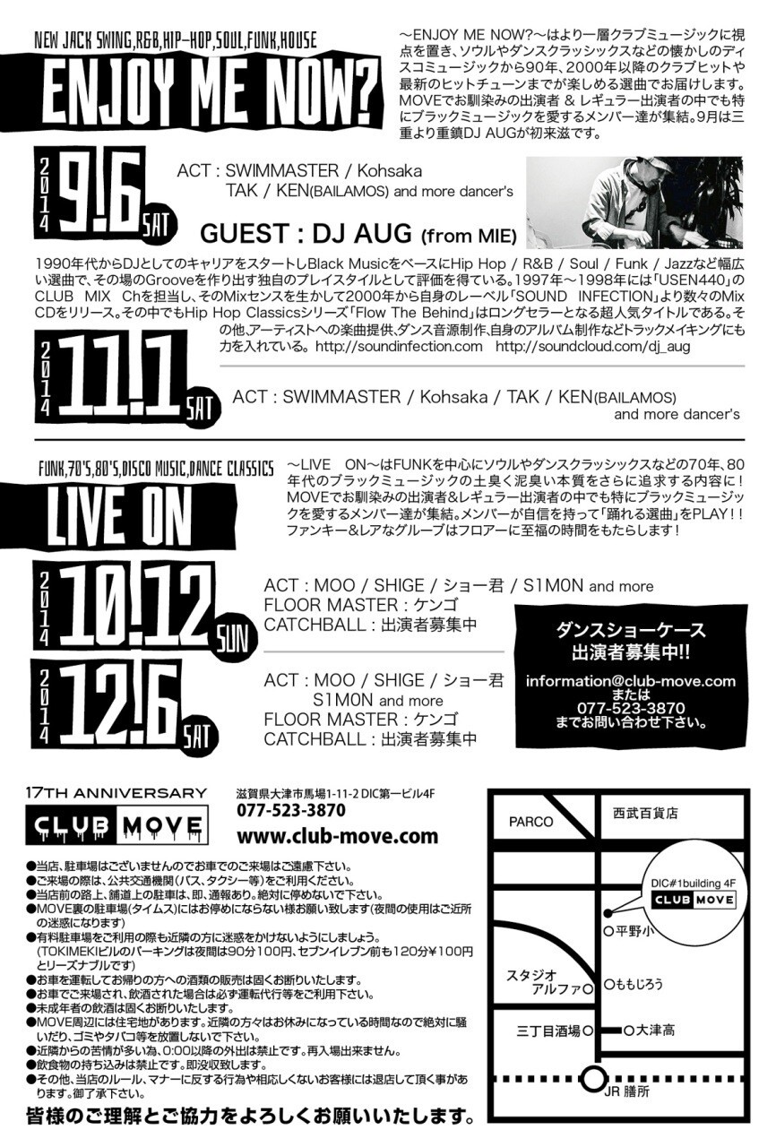 ~ENJOY ME NOW?~はより一層クラブミュージックに視点を置き、ソウルやダンスクラッシックスなどの懐かしのディスコミュージックから90年、2000年以降のクラブヒットや最新のヒットチューンまでが楽しめる選曲でお届けします。MOVEでお馴染みの出演者 & レギュラー出演者の中でも特にブラックミュージックを愛するメンバー達が集結。
