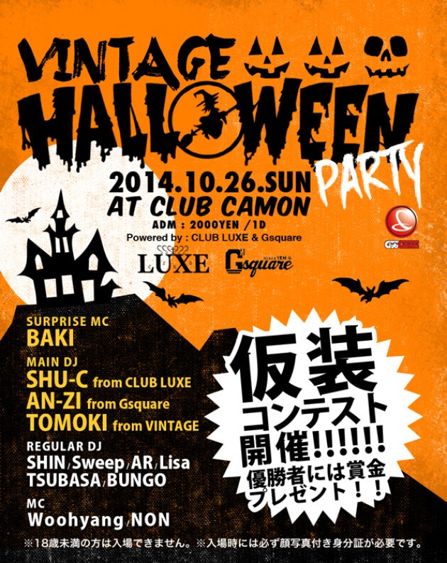 【毎週日曜VINTAGE】10/26(日)☆VINTAGE HALLOWEEN PARTY☆CLUB LUXE、Gsquareとのコラボハロウィンパーティー開催!!仮装コンテスト優勝者には賞金プレゼント★★日曜カモンは関西主要CLUBで活躍中の次世代メンバーでお届けするEDM & ALL MIX PARTY『VINTAGE』☆☆