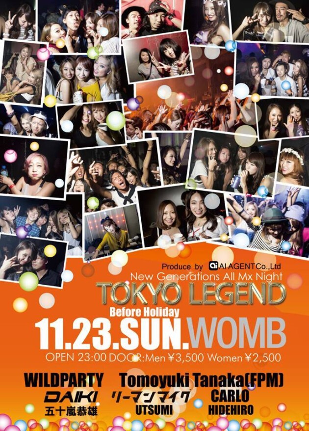 今回ゲストにハードコア、ベース ライン、エレクトロ、ヒップホップ、アイドルポップ、アブストラクト、アニソン、ゲーム音楽、ブレイクコア、歌謡まで縦横無尽に貪り尽くすボーダーレスな次世代型として絶対的な地位を確立している WILDPARTY が登場。そして今年サマーソニック2014新人出演枠「でれんのサマソニ」に出演し、音楽業界にセンセーショナルなインパクトを残し、話題を総なめにした今話題のリーマンマイクの出演が決定した。更に WOMB ADVENTURE 2013 にも出演し、現在海外を拠点に移し国境を越えグローバルな活動をする DAIKI が自身リリースツアーとしてメインフロアに登場する。その他都内有名ベニューにてレジデントを努める All Mix アクト陣が総出演と抜け目のないパーティータイムをお届けする TOKYO LEGEND 是非ご期待ください。
