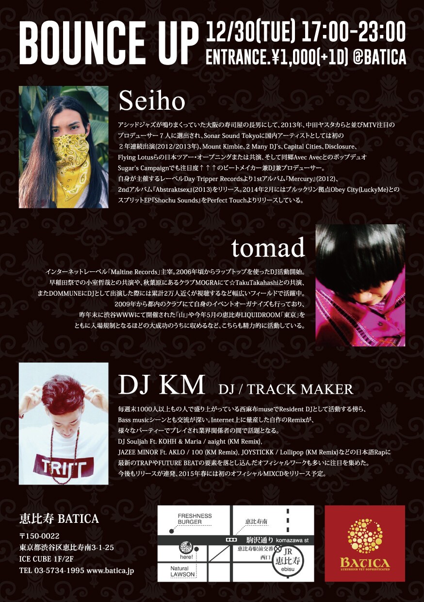 HipHopアーティストKOHHや東京女子流にまで幅広い楽曲を提供するDJ/TrackmakerのDJ KMやLA発世界最大級のキュレーション型ラジオメディアSoulection 唯一の日本在住メンバーでDJのYUKIBEBなどジャンルを越えた豪華メンバーが集結し2014年最後のパーティを締めくくる。