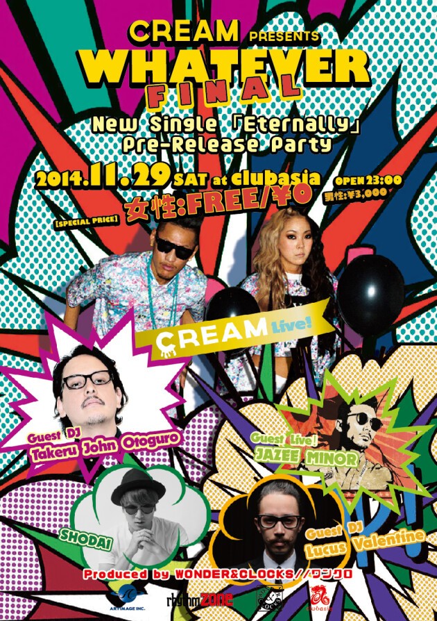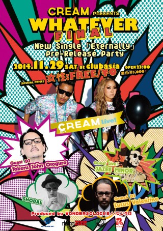 いまやダンスミュージック界のみならず、J-POPシーンからも絶大な支持を得るMinamiとStaxx Tによるユニット、CREAM。そのレギュラーイベント「WHATEVER」がclubasiaの夏限定・大人気パーティ“泡パ”とコラボした前回に続き、11月29日(土)に開催される。最新デジタルシングルのプレリリース・パーティを同時展開する今回は、CREAMが次なるステージへと突入すべく、一旦、「WHATEVER」の休止を宣言。そのファイナルにてスペシャルライヴを披露することとなった。CREAMが自身のキャリアを振り返るかのように、これまでのヒット曲や代表曲を一挙に披露。いち早く解禁となる新曲「Eternally」も交え、アグレッシヴなパフォーマンスでクラウドを熱狂させる。他にも、盟友:Takeru John OtoguroとLucas Valentineに加え、ゲスト・ライヴアクトとしてJAZEE MINORも参戦。エレクトロもヒップホップもEDMも巻き込み、CREAMとその仲間たちが最高にエキサイティングな時間をプレゼントする!