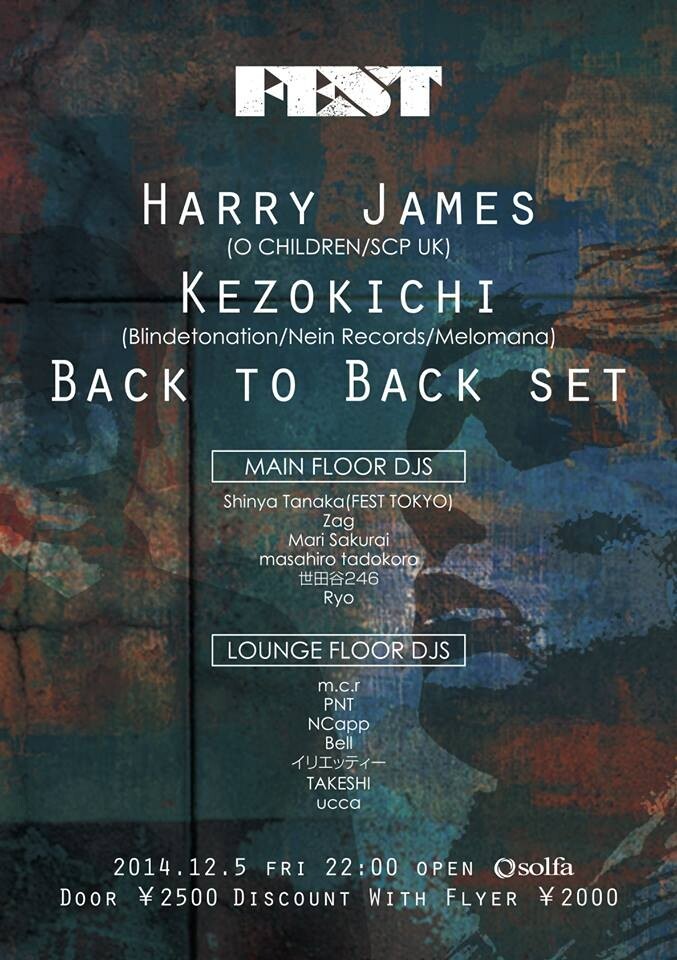 ヨーロッパ・メキシコツアーを控えているKezokichiと世界中のフェスティバルでミュージシャンとしてプレイするHarry Jamesは度々ロンドンで競演してきたが、今回日本ではFESTで初競演。イーストロンドンのアンダーグラウンドシーンでプレイしてきた2人の競演を体感しにきてください。