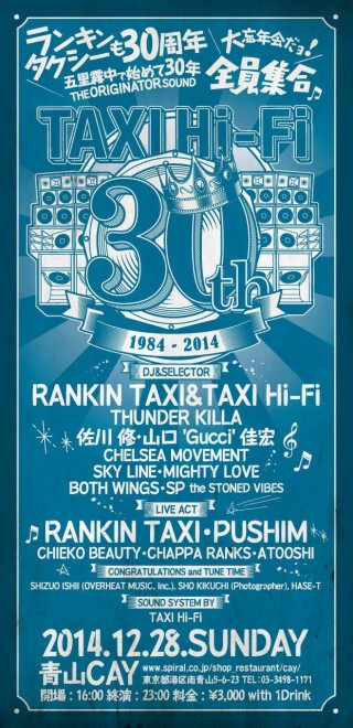 RANKIN TAXI率いるTAXI HI-FI、日本でサウンドシステムを本格的に始めたオリジナルサウンドが活動を始めて今年で30周年。それを記念して、今年最後の日曜日に30周年記念イベント&大忘年会を開催。