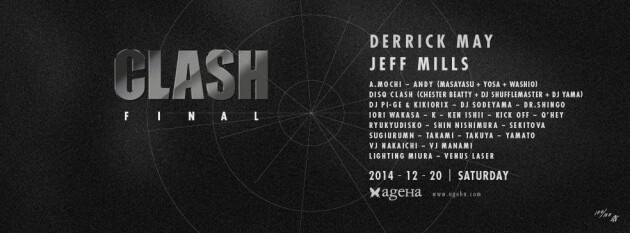 最終回となる12月20日(土)のCLASHは、テクノシーンのオリジネーターでありレジェンドとして、今なお変わらぬ人気と実力で活躍を続けるDERRICK MAYとJEFF MILLSの2人をゲストに迎え、まさにファイナルに相応しいスペシャルな共演が実現した。