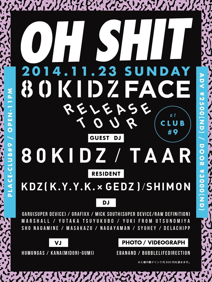 【GUEST DJ】80KIDZ, TAAR【RESIDENT】KDZ(K.Y.Y.K.×GEDz), SHIMON【DJ】GARU(SUPER DEVICE), GRAFIXX, MICK SOUTH(SUPER DEVICE/RAW DEFINITION), MARSHALL, YUTAKA TSUYUKUBO, YUKI from UTSUNOMIYA, SHO NAGAMINE, MASAKAZU, NAGAYAMAN, SYUHEY, DELACHIPP【VJ】Humungas, kana(midori-gumi)【PHOT / VIDEOGRAPH】EbanAnd, bubbleLIFEdirection