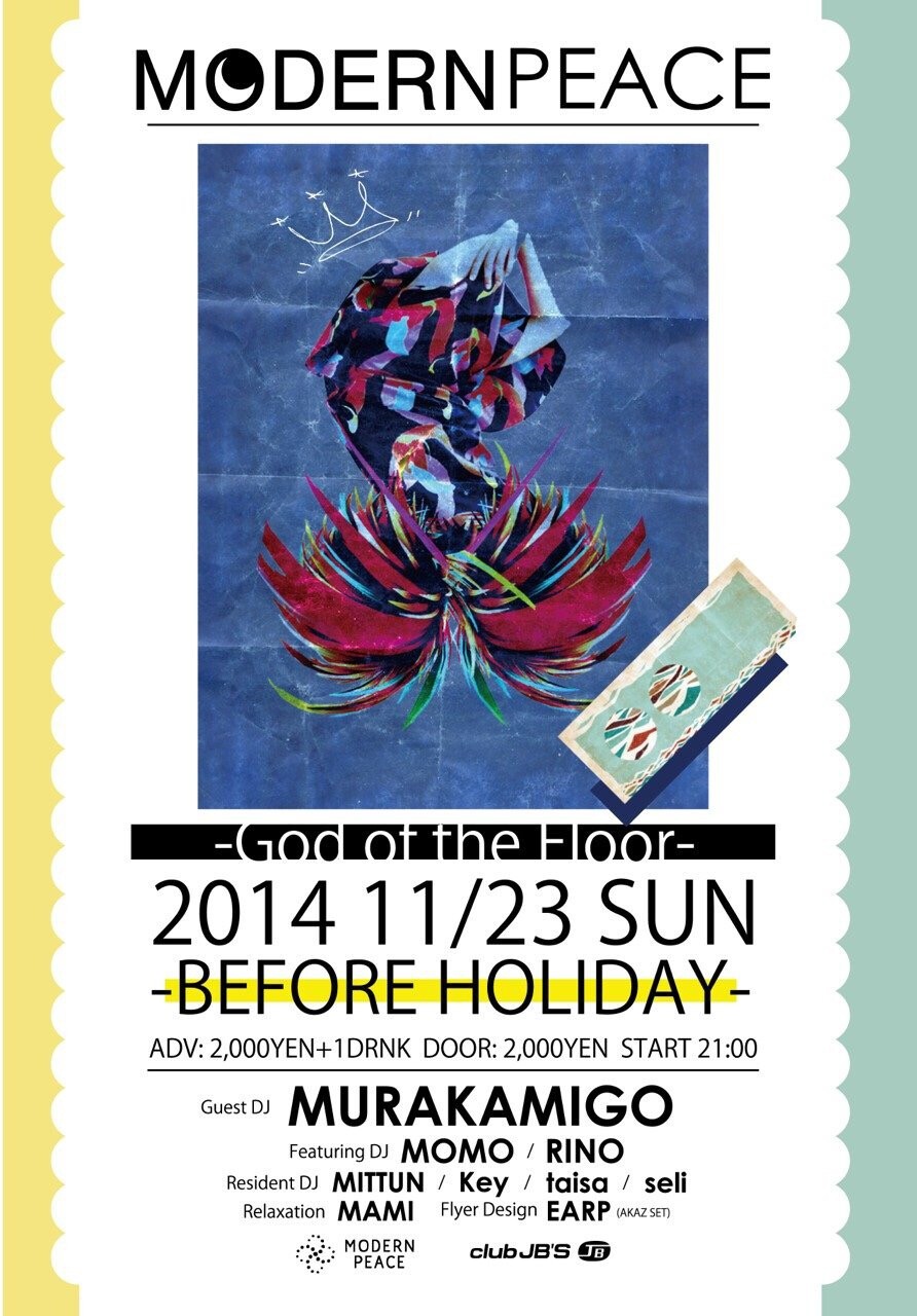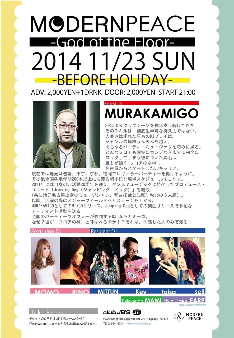 今回のGuest DJ、「フロアのネ申」MURAKAMIGO氏がJB'Sに降臨!!ネ申が繰り出す本気のダンスミュージックをカラダとココロで感じてみてください!!Featuring DJのMOMO & RINOも約2年ぶりのモダピ参戦です!!!前回に引き続きMAMIさんのマッサージもありますよwww