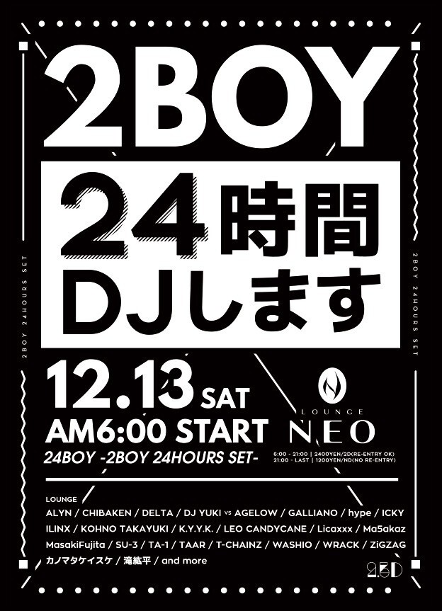 DJ、デザイナーとして活躍する渋谷・原宿のアイコン”2BOY”が12/13の朝6時からの24時間DJに挑むことが決定した。