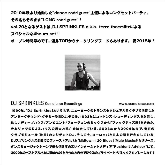 2010年秋より始動した"dance rodriguez"主催によるロングセットパーティ、その名もそのまま"LONG rodriguez"!