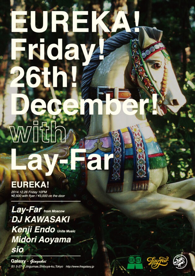 「Quality house music is never betray」をテーマに、今年2月にベルリンからKyodaiを招聘し、7月にはスウェーデンの新興レーベルLocal Talkとのレーベルショウケースを実現したEUREKA!が、次なる刺客としてロシアはモスクワからLay-Far迎える。デトロイトを彷彿させる深いサウンドから、ジャズやファンクを有機的に織り交ぜた彼のハウスは日本でも徐々に噂になり、DJ KAWASAKIがPaul RandolphそしてMakotoと共作した新作「Where Would We Be」をRemixしたことでも話題になっている。ファッションの震源地でもある原宿のヴェニューGalaxy-gingakeiにて年の瀬を飾る貴重な一夜が幕を開ける。