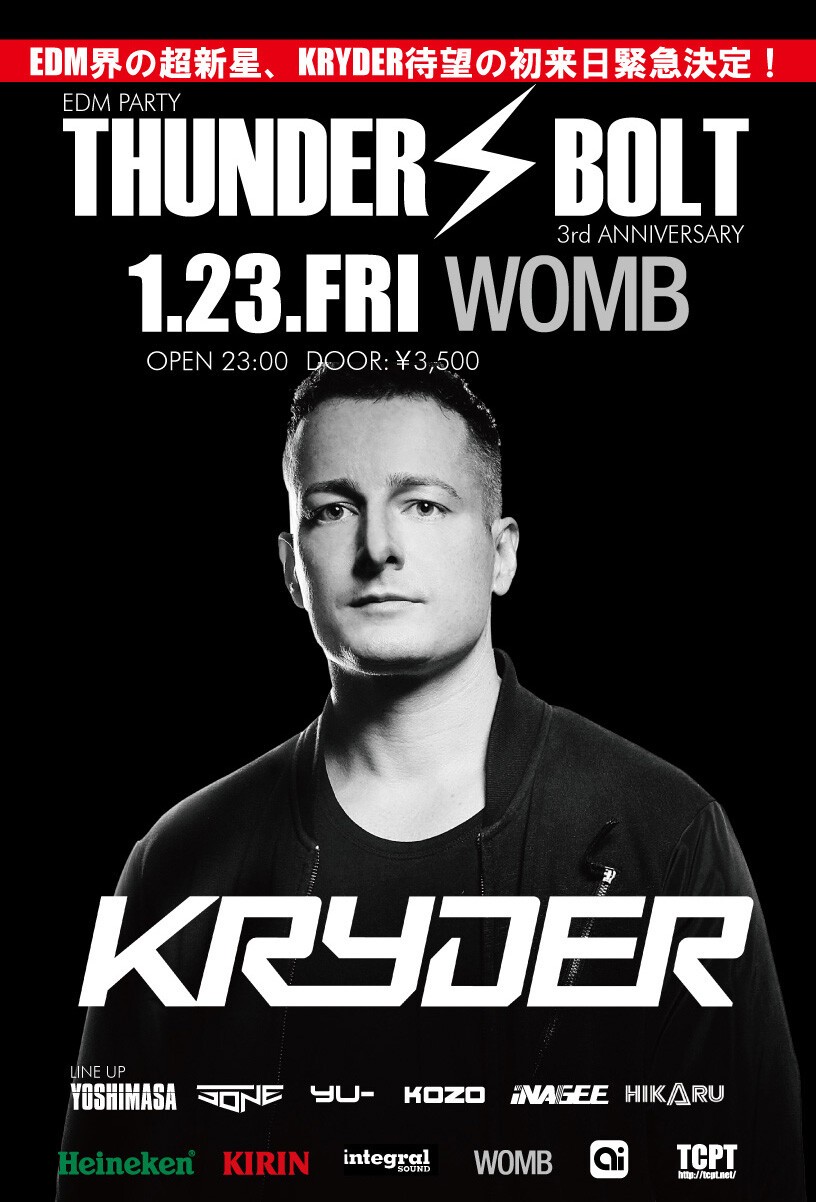 2012年1月 LAZY RICH をWOMBに招集してスタートした THUNDERBOLT が1年間の沈黙を破って2015年1月いよいよ再始動! 再始動1回目のゲストは昨年大ヒットした"Armin van Buuren/Ping Pong"の Remix で一躍注目を集め、EDM アーティストとして世界的にも評価を得ている EDM 界の超新星、KRYDER が登場!