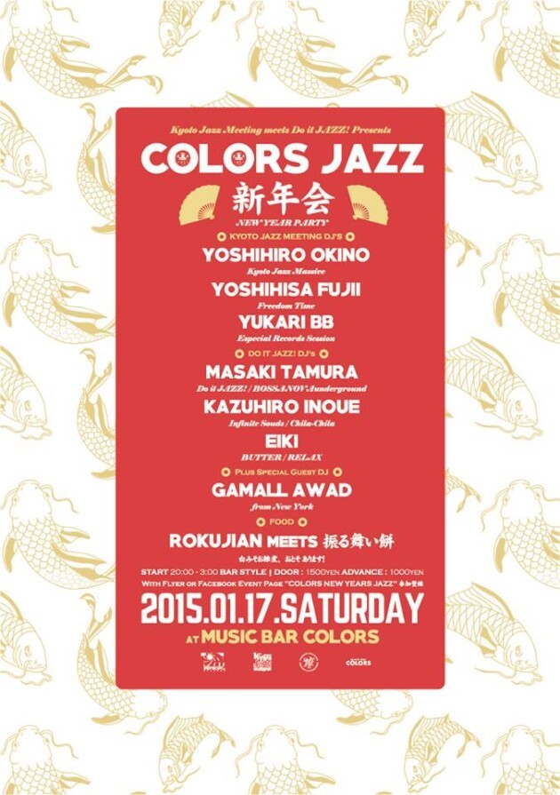 music bar COLORS、2015年最初のイベントは、Kyoto Jazz Massive主宰の"Kyoto Jazz Meeting"と、METROを拠点として活動する"Do It JAZZ!"との合同新年会にてスタート!前半はDo It JAZZ! DJ's、そして中盤にはNYから来日中のノーザンソウルDJ Gamalのゲストプレイ、そして後半はKyoto Jazz Meeting DJ'sが、ジャズ/ソウル/ファンク/ブラジリアンからクロスオーバー/ハウス/ブギー等迄幅広く選曲します!