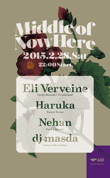 dj masdaがレジデントを務めるパーティ“Middle of NowHere”は、田中フミヤをフィーチュアして大いに盛りあがった昨年8月以来、久々の開催。今回のメインアクトに登場するのは、コアなダンスミュージックファンから絶大な支持を獲得するチューリッヒ出身のフィメールDJ Eli Verveineだ。一貫してディープなトリップ感と骨太な音圧を主軸に置きながら、ミニマルな音数の時間帯においてもキックとベースの躍動感を失わないそのプレイスタイルは、オーディエンスをフロアから出させない中毒性をもつ。Panorama BarやRexといった欧州の名門を初め、世界中のクラブで活躍する彼女のスキルを堪能してほしい。