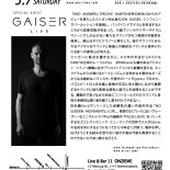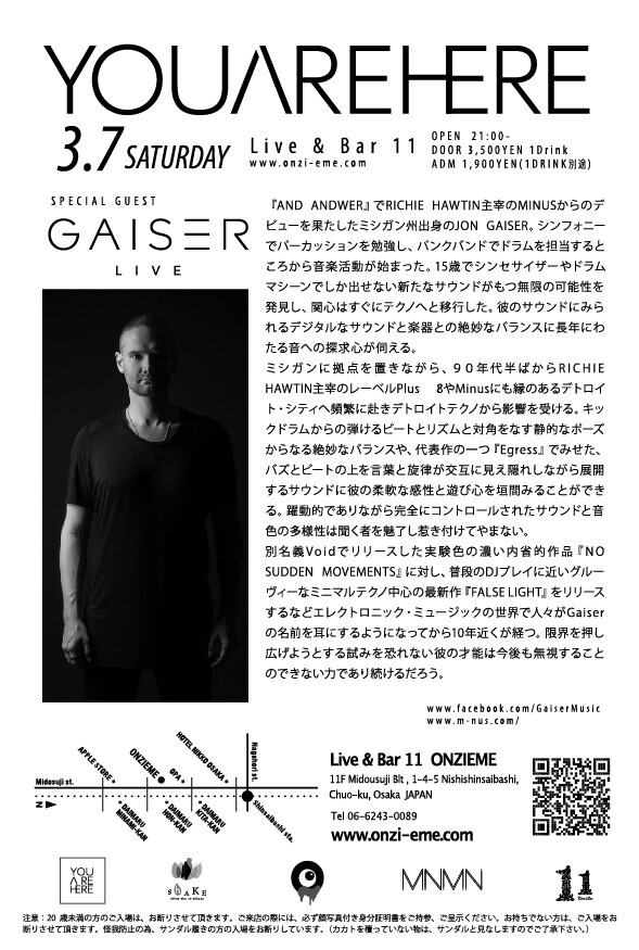 RICHIE HAWTIN主宰のMINUSから2014年末にニューアルバムをリリースしたばかりのJON GAISERはミシガンに拠点を置きながら、90年代半ばからPlus 8やMinusにも縁のあるデトロイト・シティへ頻繁に赴きデトロイトテクノから影響を受ける。キックドラムからの弾けるビートとリズムと対角をなす静的なポーズからなる絶妙なバランスや、代表作の一つ『Egress』でみせた、バズとビートの上を言葉と旋律が交互に見え隠れしながら展開するサウンドに彼の柔軟な感性と遊び心を垣間みることができる。躍動的でありながら完全にコントロールされたサウンドと音色の多様性は聞く者を魅了し惹き付けてやまない。