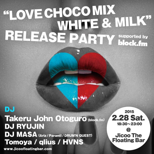 "Smooth Navigation"のTakeru John Otoguroによる、2/4にメジャー第2弾となるMIX CD「LOVE CHOCO MIX WHITE」の発売を記念して、東京湾に浮かぶ船上バー"Jicoo The Floating Bar”にてblock.fm全面サポートによるリリースパーティーの開催が決定。当日は同日発売された「LOVE CHOCO MIX MILK」を手掛けた名古屋を拠点に活躍するDJ RYUJINを招き、他にもThe Block Partyなどにも出演してきたDJ MASA、Tomoya、"EDM Space"のqlius、HVNSなどが出演。この日は全DJが他ではなかなか聴けないレアな「バレンタインデイ & ホワイトデイ」をテーマにした選曲SETで一夜を演出。この日のためだけのスウィートなスペシャルドリンクも用意し、海抜0メートルからの東京湾の夜景が楽しめる特別な一夜をお届けします。