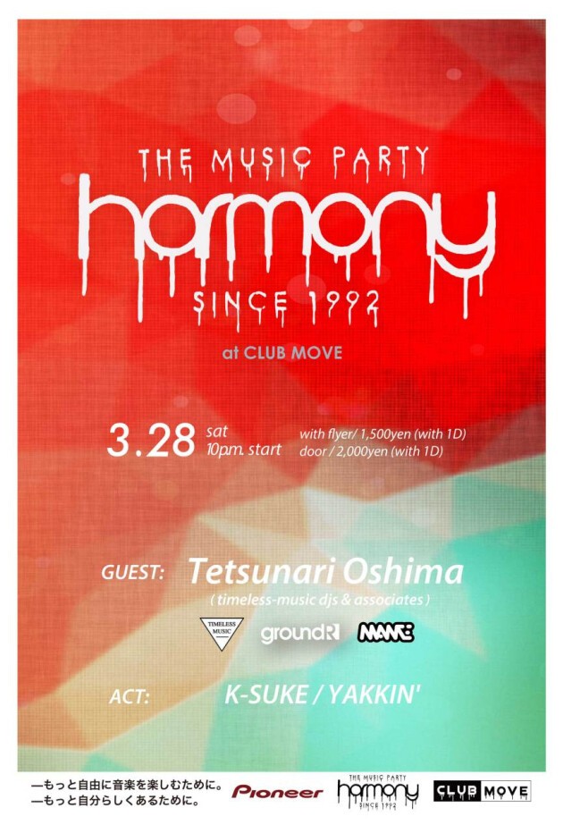 3月のHARMONYは大津市南郷の"Stgw Basement"のサウンドシステムエンジニアとDJを努めるTetsunari Oshimaが来てくれます。 音楽を取り巻く環境の変化が著しい昨今、このHARMONYだけはいつも変わらず温かい場所であり続けたいと思います。新旧織り交ぜて、様々なジャンルをクロスオーバーさせて、刺激的なミュージックライフを今回もみなさんと楽しんでいけたら幸いです。それでは今月もHARMONYでお会いしましょう。...