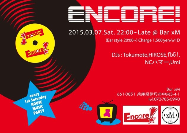 毎月第一土曜日開催のハウスイベント"Encore!(アンコール)" 今回は、DJグループ"fatfamily"を統率するfb5!氏、京都&大阪で中心に活躍するNCハマー氏を迎えてお送りします。 どっぷりハウスに浸れる一夜になること間違いなしです!!!! 是非とも3/7(土)は伊丹BarxMにてお待ちしています。 DJ:Tokumoto,HIROSE,fb5!,NCハマー,Umi Charge:1,500YEN/1DR