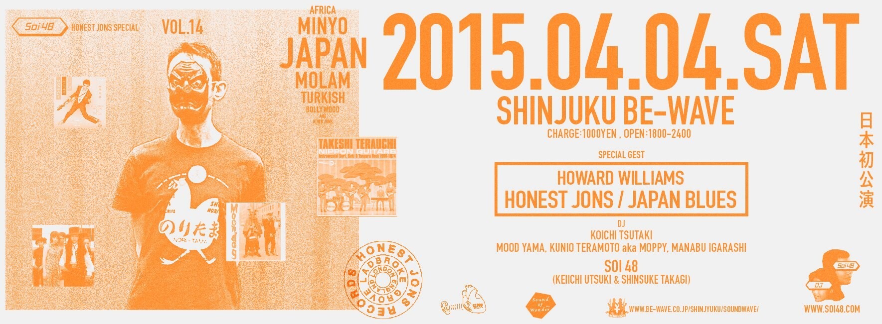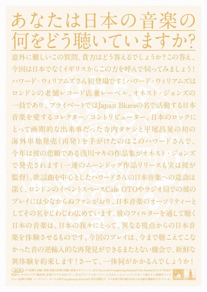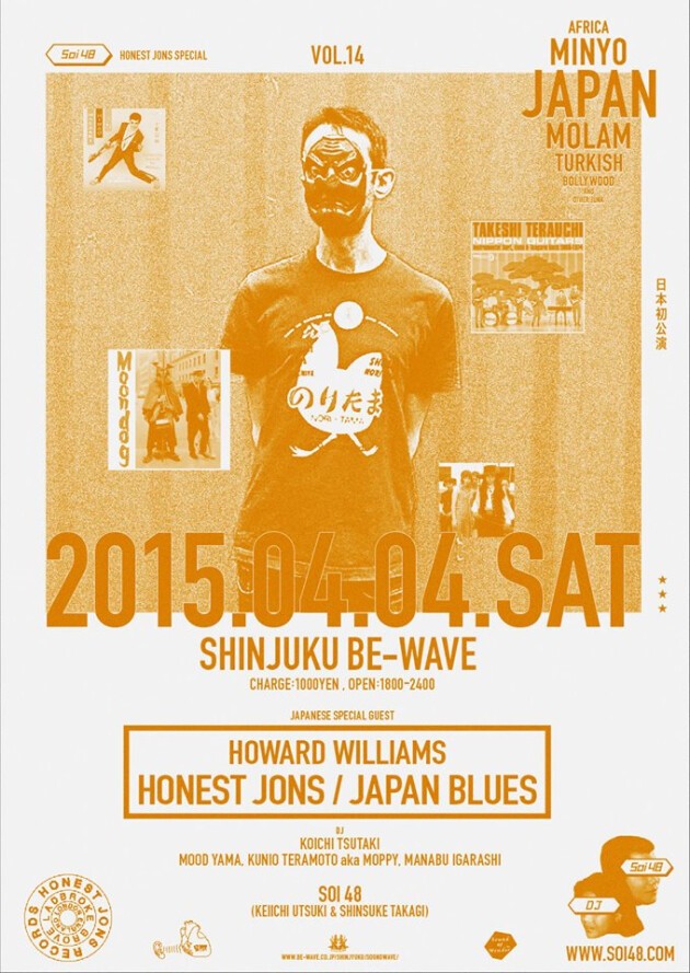 AWESOME TAPES FROM AFRICA初来日公演に続いてSoi48 VOL.14には英国の老舗レコード店HONEST JONSからHOWARD WILLIAMSを招いての『日本の音楽』スペシャル!寺内タケシと平尾昌晃の初の海外単独発売(再発)を手がけた生粋の日本音楽好きであるハワードさんによる逆輸入的邦楽DJは要必見!Soi48のレギュラー陣も民謡、里謡、NEW WAVEなど日本の音楽を紹介したいと思います。もちろんタイ、エチオピア、トルコ、レバノン、ギリシャなどの世界各国のレコードもプレイ予定!所謂『和モノ』とは一味違うSoi48的パーティー、皆様のご来場お待ちしております。