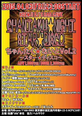 所謂普通のディスコチューンがディスコと思う人もいれば、『俺にとってのディスコチューンはメタルだ!!』って人もいますし『いやいや、わたしのディスコチューンはV系なのよ!!』って人もいると思いますので、ホント出演者のカラーが出ちゃうような夜、それがちゃんたく☆ないとVol.2~スター☆ディスコ~のコンセプトです!