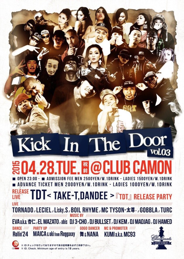 【HIP HOP PARTY】4/28(火)(祝前日)☆毎回満員御礼の『Kick In The Door』の第3弾が開催決定!!TAKE-T、DANDEEによるユニットTDTの1st ALBUM 『TDT』RELEASE PARTY!!関西HIP HOPアーティストが勢揃いする激ヤバパーティー!!