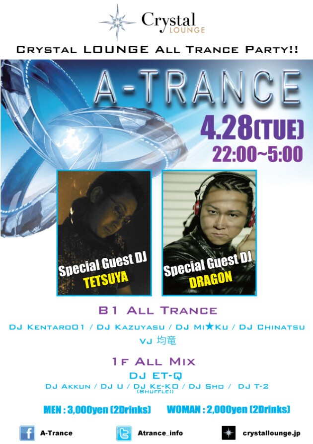 青山クリスタルラウンジで毎回祝前日に開催されている【A.Trance】に今回はゲストDJでTetsuya&Dragonの