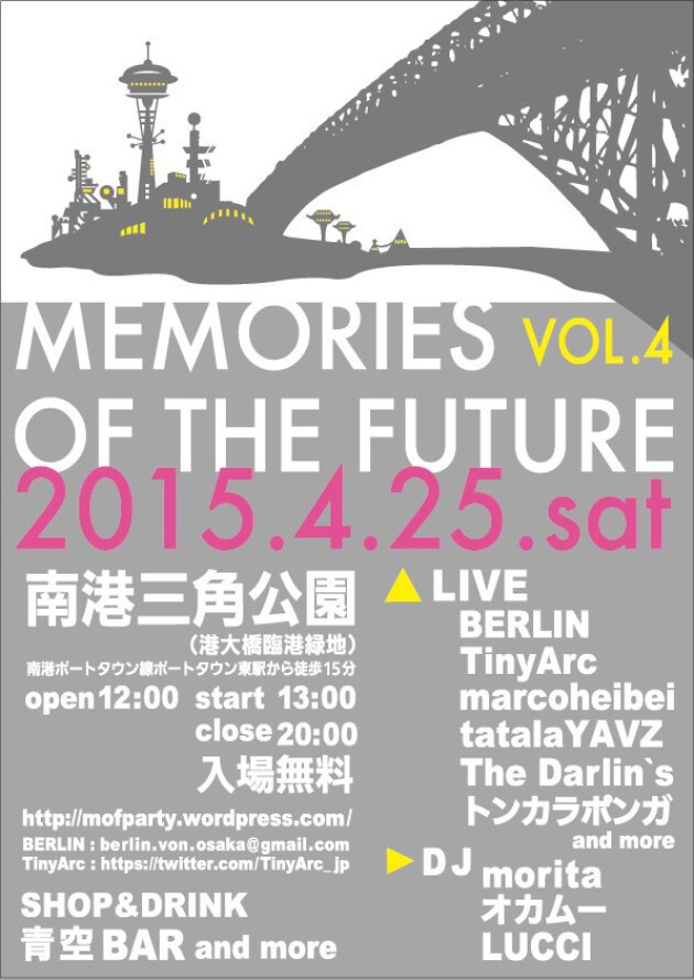 今回も主催の世界を旅するジャムバンド「TinyArc」&ジャーマン直系人力即興トランス「BERLIN」と再度登場、独特の浮遊感あふれる空間を生み出すトライバルアンビエント楽団「marcoheibei」に加え、ツインドラムス+トラックメイカーで無二のビートを叩きだすインストトリオ「tatalaYAVZ」、サイケなガレージロックで酔わせる「The Darlins」、和歌山からやってきたご陽気ポンコツ(?)チンドン楽団「トンカラポンガ」といった面々が新登場!