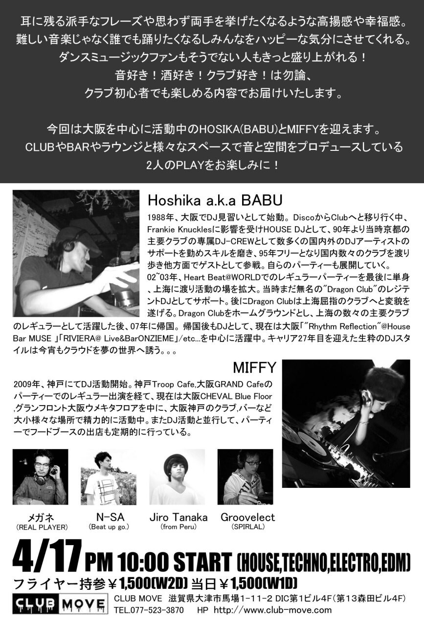 今回は大阪を中心に活動中のHOSIKA(BABU)とMIFFYを迎えます。CLUBやBARやラウンジと様々なスペースで音と空間をプロデュースしている2人のPLAYをお楽しみに!