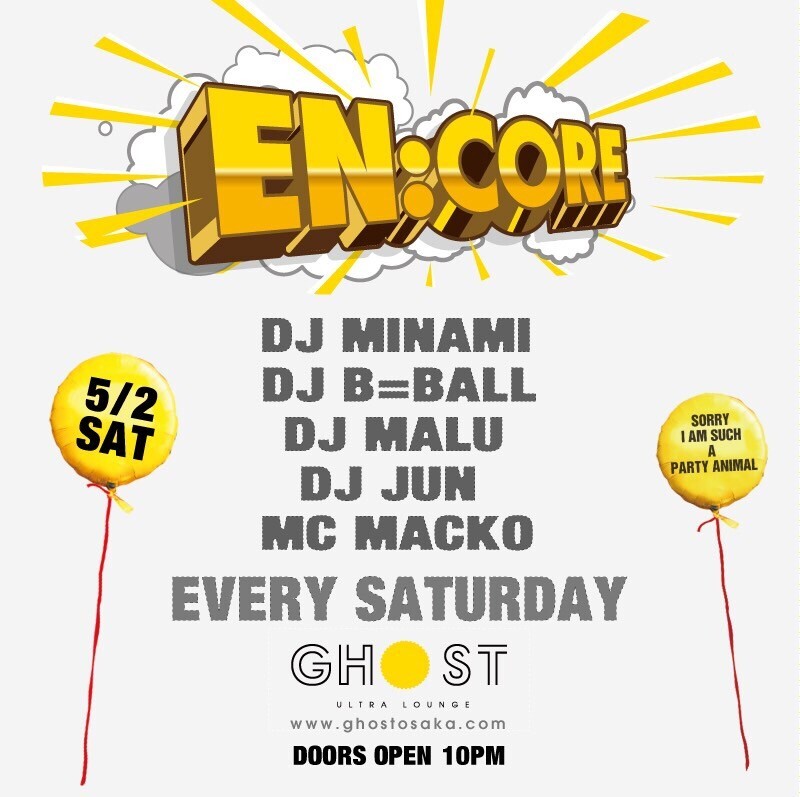 毎週土曜日のGHOSTは大阪のクラブシーンを常に最先端へ引っ張って来たDJ陣を揃え、HIP HOPをベースに"今一番クラブで盛り上がる曲"をオープンフォーマットスタイルでお届けする『EN:CORE』!HIP HOP好きのアナタはもちろん、海外のクラブシーンを追いかけるSoundCloud中毒のアナタもきっと満足できる、唯一無二の内容でアメ村の土曜日の夜を彩ります。