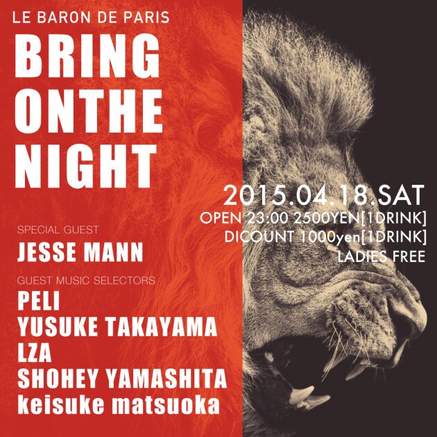 東京唯一無二のカルチャー発信を担うLe Baron de Paris 。今宵はファンク、ソウル、ディスコ、ディープハウス、アフロビートetc...ジャンルにとらわれないフリースタイルミックスでダンスフロアを涌かせるブルックリンからの使者"JESSE MANN"がSPECIAL GUESTとして登場。さらにGUESTには時代のスピリットから派生したレジデントPELIから独自のスタイルで音を感じさせるYUSUKE TAKAYAMAなど個性溢れるDJ陣が勢揃い!ディスコ、ファンク、ヒップホップ、ハウスが織り交ざった、BRING ON THE NIGHTを堪能あれ!