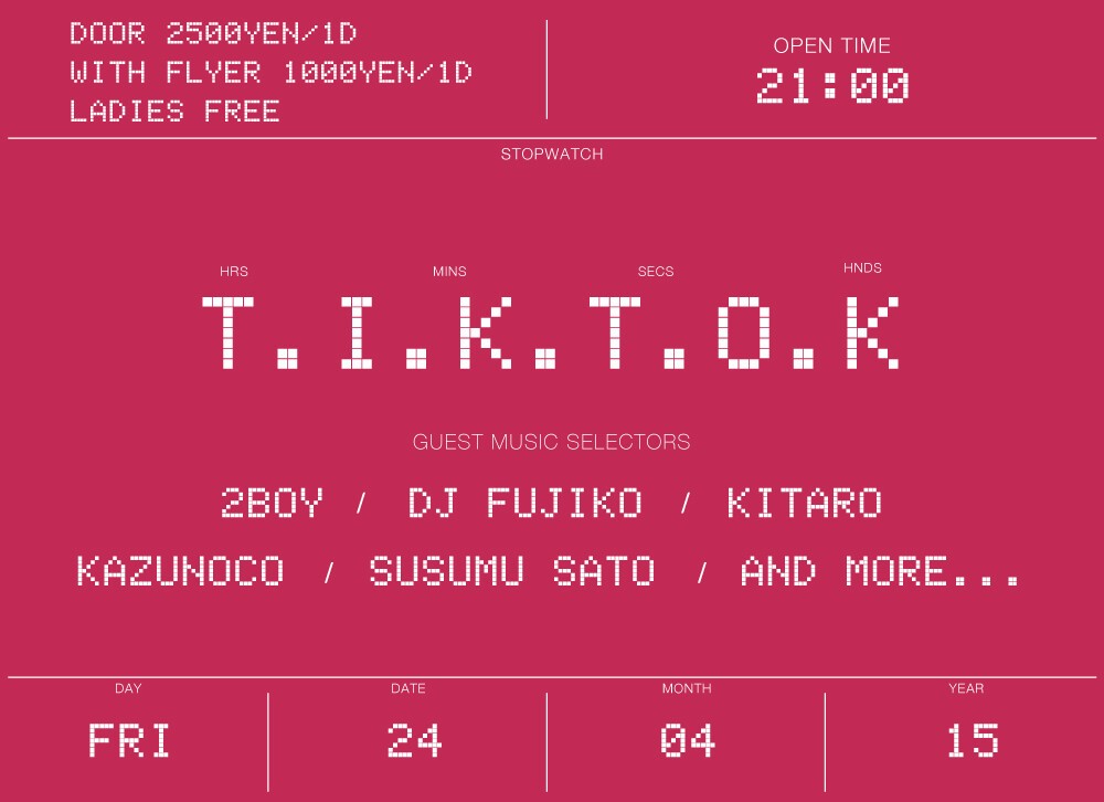 オルタナティブなエンターテイメント性に富み、あらゆるグッドミュージックを自在に操る2BOYや、錚々たるファッションイベントで腕を鳴らしてきたDJ FUJIKOが登場するT.I.K.T.O.K。楽しさのリミットを振り切って、彼らの音楽に酔いしれて。