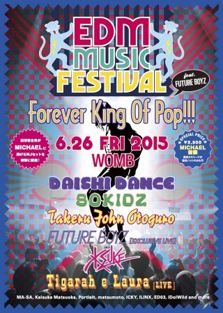全世界を巻き込んだビッグムーヴメント、EDM。その本来の魅力や先進性を説く、本格派EDMパーティ『EDM MUSIC FESTIVAL』が6月26日に開催される。しかも、そのタイミングは期せずして、あの“キング・オブ・ポップ”ことMICHAELの六周忌直後。そこで今回は、出演者が彼へのリスペクトを捧げる特別なパフォーマンスを披露することとなった。今回、ヘッドライナーを務めるのはDAISHI DANCE。自身の楽曲をリ・エディットしたベストアルバム「Timetraveler」をリリースしたばかりのDAISHI DANCEが、エキサイティングなサウンドをWOMBに届ける。さらに、リアルタイムなトレンドを踏襲しながら、エレクトロ・ブレイクビーツやロック、テクノなど変幻自在で奔放なサウンドを放つ80KIDZ。さらに、エキサイティングなパーティ配達人:Takeru John Otoguroも登場する。そしてもちろん、日本発EDMデュオ:FUTURE BOYZがライヴパフォーマンスを披露。他にも、これからのシーンを体現するEDM世代のアーティストが多数参戦。『EDM MUSIC FESTIVAL』が、音楽シーンの最前線へクラウドを導く!