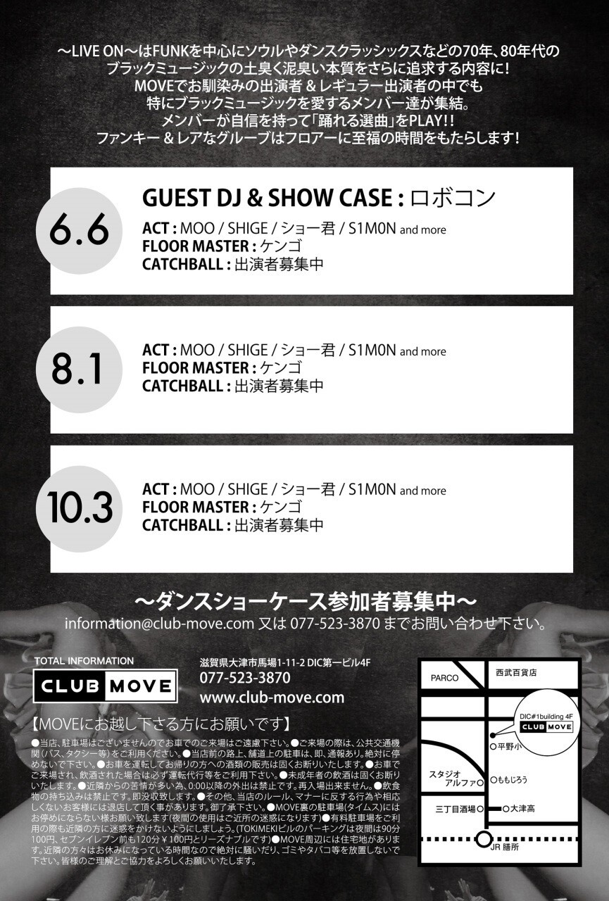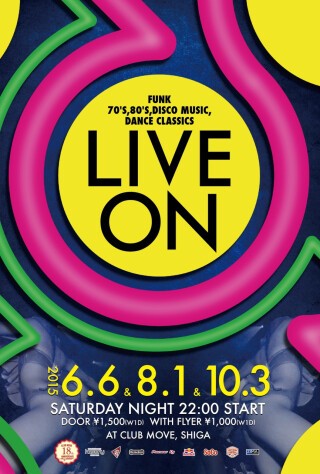 ~LIVE ON~はFUNKを中心にソウルやダンスクラッシックスなどの70年、80年代のブラックミュージックの土臭く泥臭い本質をさらに追求する内容 に!MOVEでお馴染みの出演者 & レギュラー出演者の中でも特にブラックミュージックを愛するメンバー達が集結。メンバーが自信を持って「踊れる選曲」をPLAY!!ファンキー & レアなグルーブはフロアーに至福の時間をもたらします!